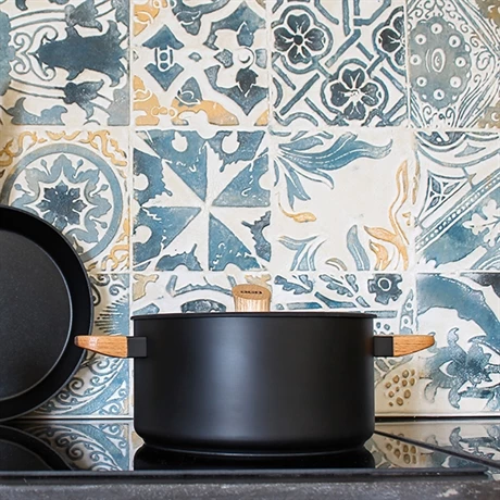 Le contraste entre le chêne massif et l’aluminium forgé noir mat donne du cachet à ces pièces robustes aux inspirations scandinaves. Les cuves sont revêtues de PFTE certifié Greblon 3 couches. Ainsi, vous pouvez cuisiner avec très peu de matière grasse sans que cela n’accroche au fond de votre poêle ou votre casserole. Compatible avec l’induction, les poêles, casseroles et la faitout sont parfaitement fonctionnels.