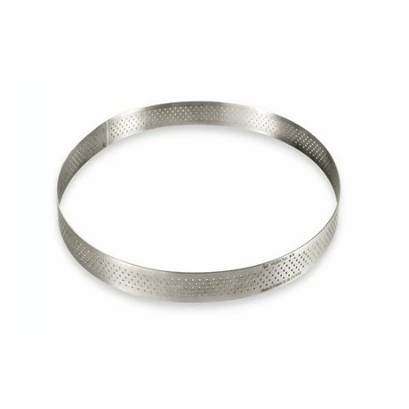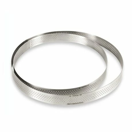 Ce cercle à tarte rond perforé de 28,5 cm vous permettra de réaliser des tartes et entremets parfaitement ronds. Le bord droit permet une finition impeccable et un démontage facile et sûr. Ces cercles sont constellés de trous pour une cuisson uniforme des bords de tartes. C’est LE cercle indispensable pour les cuissons de pâtes sablées, sucrées ou brisées.
