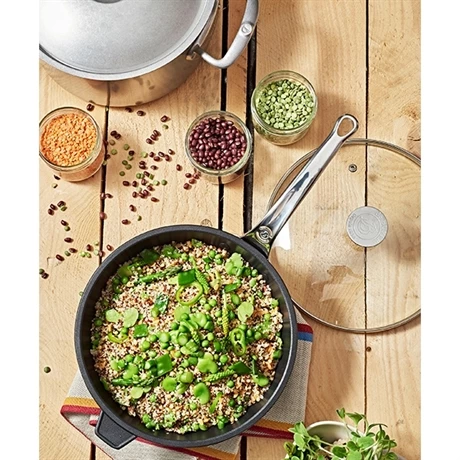 Equipée d’une queue « à la française » revisitée pour un design plus moderne, la sauteuse Choc Extrême De Buyer se manipule en toute sécurité grâce à la conception de la queue en fonte d’inox, matériau totalement isolant. Ergonomique, sa forme est faite pour un geste sûr, stable et confortable.