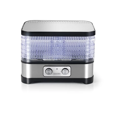 L’appareil est doté de 5 plateaux amovible en plastique sans BPA (24 x 31 cm) sur 2 hauteurs différentes soit 3720 cm2 de surface de séchage totale. Le séchage se fait par un système de ventilation chaude.