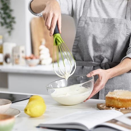 Le fouet 2 en 1 Joseph Joseph avec sa forme modifiable permet de s’utiliser comme fouet plat ou fouet ballon. Le fouet plat est pratique pour mélanger les sauces et les jus dans un récipient avec peu de contenance. Alors que sa forme traditionnelle en ballon est idéale pour fouetter ou mélanger les œufs ou autres préparations. Grâce à sa matière en silicone, le fouet 2 en 1 Joseph Joseph se nettoie très facilement. Pour changer le fouet de forme, il suffit de tourner la poignée d’un côté ou de l’autre. En forme plate, le fouet offre un rangement compact, aisément rangeable dans un tiroir de votre cuisine.