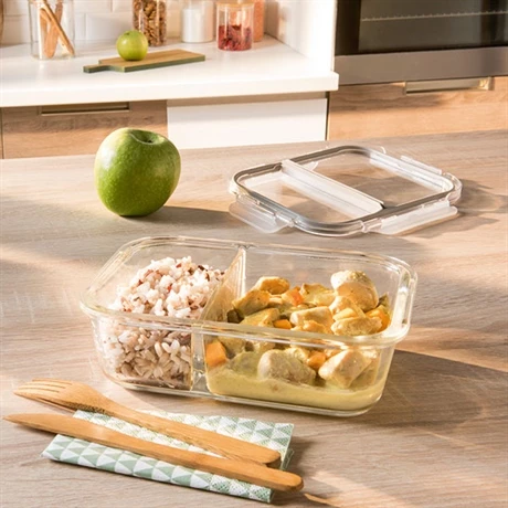 La boite en verre borosilicate à 2 compartiments Mathon de 950 mL a un bon format pour vous servir de boite repas à emporter au travail. Les 2 compartiments sont indépendants avec une séparation pour ne pas mélanger votre viande et son accompagnement ou encore pour mettre la sauce de côté.