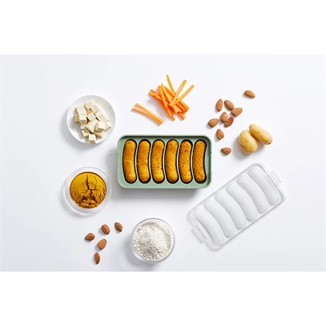 Pour tous ceux qui ont opté pour une consommation flexitarienne, végétarienne, vegan ou ceux qui veulent tenter de nouvelles recettes végétales, Lekué a créé le Veggie Sausage. Grâce à ces moules en silicone, vous allez pouvoir cuisiner des saucisses végétariennes et les cuire au micro-onde en quelques minutes. Le moule Veggie Sausage passe également au four ou convient à une cuisson vapeur. Pour compléter la première cuisson, vous pouvez poêler vos saucisses une fois démoulées pour obtenir une texture croustillante.