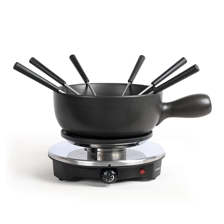 Deux recettes pour cet appareil à fondue électrique 1500 W avec bol en céramique : la fondue traditionnelle au fromage, dite « savoyarde » et la fondue au chocolat, possible grâce à sa grande puissance de 1500 W. Pratique, la poignée latérale du bol assure une bonne prise en main et le support en acier inoxydable avec plaque chauffante en aluminium peut chauffer tout récipient de forme adéquate.