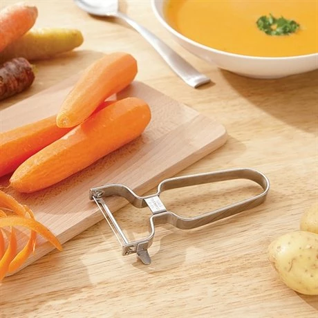 - L’éplucheur à lame droite de Mathon en inox est l’ustensile indispensable dans toutes les cuisines. Sa lame droite en acier inoxydable, aussi coupante qu’une lame de rasoir, épluche en un clin d’œil tous vos fruits et légumes sans effort même pour les peaux les plus épaisses : pommes de terre, pommes, concombres, carottes… rien ne lui résiste ! Il est idéal pour éplucher sans perdre de chair les légumes tendres et frais comme le gingembre ou les pommes de terre nouvelles…Astucieux, le manche forme Y intègre une lame annexe de chaque côté qui sert de grattoir pour enlever les impuretés et les yeux des pommes de terre. Pratique, sa poignée ergonomique est pensée pour une prise en main parfaite pour gauchers et droitiers, améliorant efficacité et rapidité pour un gain de temps incomparable en cuisine. En inox, l’éplucheur est robuste, élégant et passe au lave-vaisselle pour un nettoyage facile. Sa forme plate permet un rangement facile dans vos tiroirs.