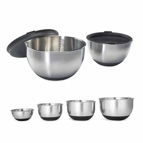 Ce lot comprend 6 bols en inox gradués avec base silicone 10,5 à 24 cm. Les deux plus grands bols de 20 et 24 cm possèdent des couvercles spécialement adaptés permettent de laisser reposer ou de conserver vos préparations à l’extérieur ou au réfrigérateur sans laisser entrer d’impuretés.