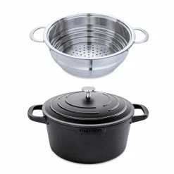 Ce lot comprend une cocotte légère ronde en fonte d’aluminium 24 cm 4,5 L et un panier vapeur multidiamètre 20, 22, 24 cm Mathon.