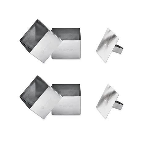 Ce lot comporte 4 Emportes-pièces carré en inox avec poussoirs de Mathon. Très simple d’utilisation, les emporte-pièces vous permettent de réaliser en un clin d’œil vos différentes préparations pour des présentations originales de forme carrée !