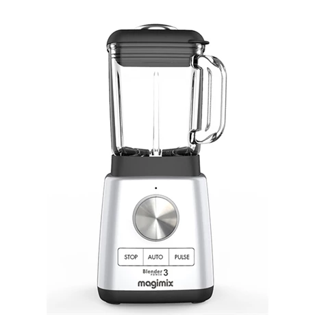 Magimix est une enseigne reconnue pour la qualité de ses appareils, et notamment au niveau des moteurs. Avec 1000 W de puissance, le blender Power 3 Magimix peut atteindre jusqu’à 22 000 tours/min et il entraîne des lames en acier inoxydable qui vous offriront une très grande force de mixage, optimale pour tout aliment même congelé. Et pour que cette puissance ne dégrade pas le bol gradué au fur et à mesure des utilisations, il est fabriqué en verre borosilicate, matériau ultra résistant, anti-rayures et antichocs. Equipé d’une spatule, d’un bouchon doseur et de trois boutons à pression, vous n’aurez qu’à presser « Pulse » pour délivrer instantanément toute la puissance du Blender Power puis « Stop » pour vérifier le résultat. Le dernier bouton, « Auto », est couplé au bouton rotatif sélecteur qui choisira soit la vitesse manuellement, soit une de ses 4 fonctions préprogrammées.