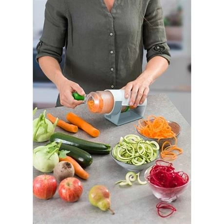 Le midi spiraliser est l’accessoire de cuisine idéal pour tous les jours grâce à son format compact et sa simplicité d’utilisation ! Vous réaliserez en un clin-d’oeil les populaires spaghettis de légumes mais aussi les fameuses tagliatelles de légumes et de fruits. Pour une cuisine facile et rapide, vous réaliserez des plats originaux et équilibrés sans vous fatiguer puisque cet ustensile de découpe ne nécessite que peu de force grâce à un système de vis innovant. Idéalement compatible avec vos pommes de terre, carottes, betteraves, pommes, poires… et vous serez guidé et inspiré grâce à un petit livre de recettes inclues.
