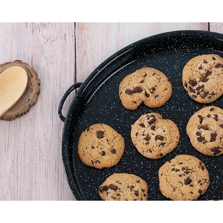 Le plateau à pizza de 34 cm de diamètre Graniteware est en acier avec revêtement céramique. De belles dimensions, il est idéal pour la cuisson au four de pizzas généreuses ou de biscuits sans besoin de badigeonner de matière grasse au préalable. La céramique est un matériau naturellement anti-adhérent et garanti sans PFTE ni PFOA. Avec son double revêtement émaillage et vitrification, ce plateau n’accroche pas et est extrêmement résistant. Vous pouvez ainsi directement couper vos parts de pizzas dessus et gratter les résidus avec votre éponge. Facile à nettoyer, il est passe également au lave-vaisselle.