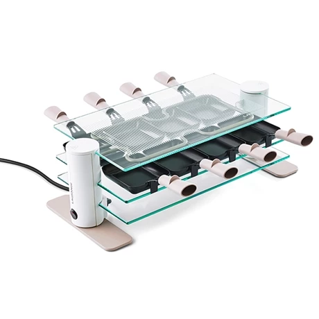 Idéale pour partager des moments conviviaux et gourmands, la raclette 8 personnes Transparence MINERAL est un appareil performant au design novateur. Doté de 3 plateaux fixes en verre trempé, ultra résistant aux chocs, retenus par deux colonnes, cet appareil est élégant et met en valeur la cuisson du fromage et des aliments. Le suivi de la cuisson est facile et les convives peuvent ainsi retirer le poêlon de la source de chaleur à leur convenance.