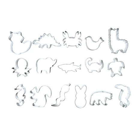 A l’intérieur du seau, vous trouverez 16 découpoirs en fer blanc aptes au contact alimentaire. Tous différents, ils prennent la forme de toucan, lama, éléphant, tortue, écureuil, requin…