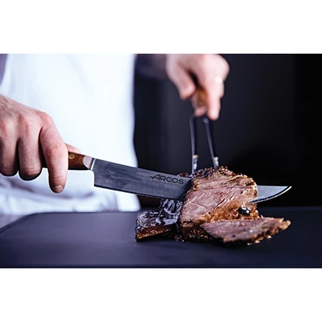 La lame du couteau est en acier inoxydable martensitique haut de gamme. Sa composition exclusive développée et déposée par Arcos sous le nom de Nitrum est enrichie d’azote pour garantir une excellente résistance à la corrosion. L’azote, obtenu à partir d’un processus respectueux de l’environnement assure dureté et robustesse à la lame pour d’excellentes découpes de vos viandes cuites au barbecue. Ce couteau à découper courbé a une lame longue de 21,5 cm et extra tranchante. Son fil de lame biseauté Silk Edge offre une découpe précise et un tranchant durable.
