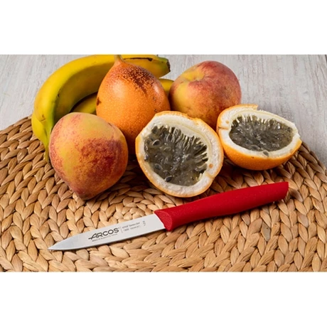 Le manche des couteaux est en polypropylène rouge. Cette matière, compatible avec le contact alimentaire, est très résistante. Elle supporte des températures négatives et allant jusqu’à 120°C, l’acidité des aliments ou encore les détergents agressifs. Pour assurer un bon maintien entre le manche et la lame, Arcos utilise un processus d’injection.