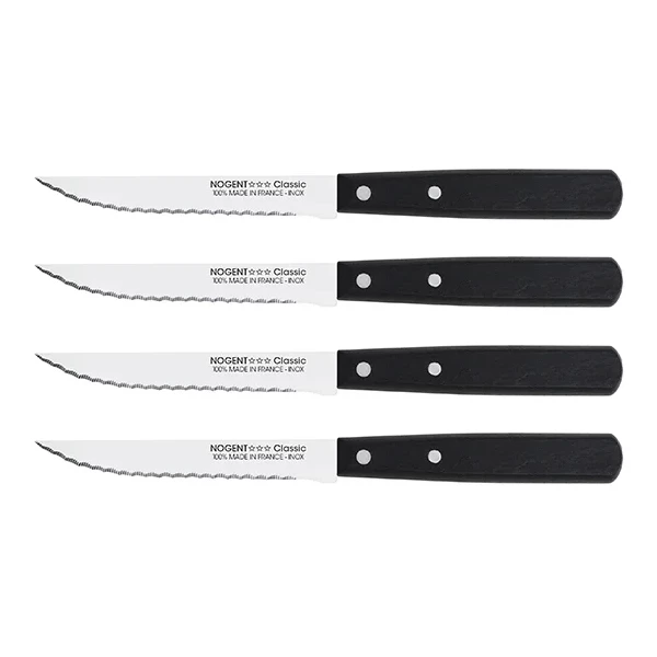 Ce set de 4 couteaux à steak identiques Nogent est pratique car il découpe les aliments de votre assiette facilement. Sa lame à double crantage de 11 cm en acier inoxydable trempée est robuste et maintenue au manche par 2 rivets solides.