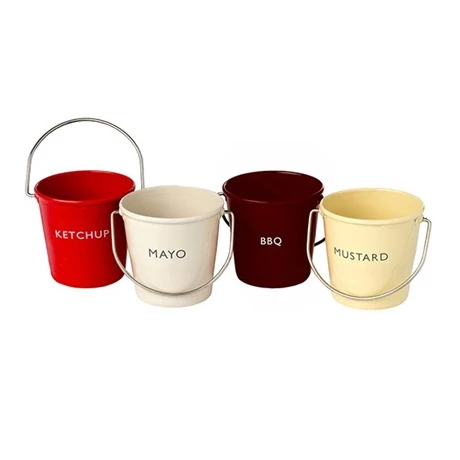 Le set de 4 seaux à condiments se compose de 4 différents seaux, chacun nommé et coloré selon la sauce pour lequel il est dédié ! Plus simplement vous trouverez un seau rouge pour votre ketchup, un beige clair pour votre mayonnaise, un bordeaux pour votre sauce barbecue et enfin un jaune couleur moutarde. Vous pourrez les utiliser quotidiennement pour la présentation de vos sauces-maisons, ou pour vos soirées barbecues entre amis ou en famille pour des tablées parfaitement décorées jusqu’aux pots de sauce disponibles ! Empilables, ils ne tiennent pas de place lorsque vous ne les utilisez pas et sont lavables à la main très facilement après utilisation. Idéal pour des repas sur le thème des États-Unis.