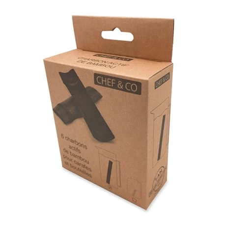 Le charbon de bambou purifie naturellement l’eau potable et réduit les mauvais goûts et odeurs, sans déchets, ni plastique. Le Set de 6 bâtons de charbon de bambou purificateur d’eau taille L permet de purifier simplement et simultanément carafe, bouteille en verre, gourde… tout en s’adaptant à la taille du récipient. Le bambou, bois écologique car poussant très rapidement, est extrêmement poreux, absorbant trois fois plus de polluants qu’un bois classique. Son utilisation est simple : chaque bâton filtre de 1,2 à 1,5 L d’eau par jour pendant 4 semaines. Placé dans de l’eau, il absorbe en quelques heures les impuretés.