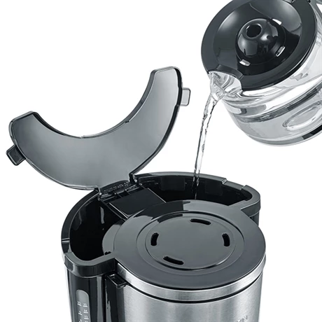 Et si vous vous leviez le matin et que votre café était déjà fait ? La cafetière filtre programmable 10 tasses 1 000 W KA4826 de chez Severin vous prépare votre café intense au gré de vos envies. Sa fonction « AromaSwitch » vous permet de choisir le degré d’intensité de votre café en tournant le bouton. Vous pouvez aussi choisir l’intensité de votre café selon la dose d’eau ou de café que vous décidez d’y mettre. Programmer plus facilement qu’un jeu d’enfant la machine avec l’écran, pour déguster votre boisson à l’heure que vous voulez. La verseuse graduée en verre vous simplifie la préparation et vous aide à savoir quelle quantité d’eau vous avez besoin selon le nombre de tasses souhaité. La quantité peut aller jusqu’à 10 tasses. Avec son design de qualité supérieure en inox, le nettoyage est facile et peut se faire au lave-vaisselle. Pratique, le porte-filtre passe au lave-vaisselle et possède un système anti-goutte.