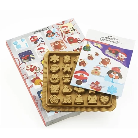 Pour faire vos chocolats de l’avent, commencez par tempérer votre chocolat puis coulez-le dans le moule 3D creative Xmas Countdown Silikomart. Enlevez l’excédent en laissant goutter votre moule au-dessus d’une grille et répétez l’action si besoin pour couvrir tout le moule. Ensuite, il ne vous reste plus qu’à faire prendre au froid votre chocolat. Démoulez vos petits chocolats facilement grâce à sa conception en silicone platinique et garnissez votre calendrier. Un livret de recettes est également fourni pour vous faire découvrir de nouvelles saveurs : faites varier les types de chocolats et les décorations pour un calendrier encore plus surprenant. Après utilisation, le moule peut être lavé directement au lave-vaisselle.
