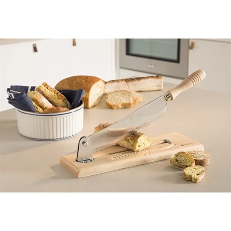 Son socle est en bois blanc avec décor épi. La lame de 25 cm est en inox.
